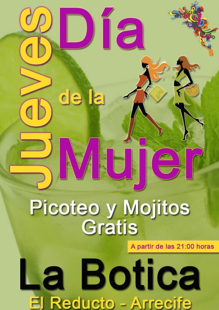 La zona de El Reducto cuenta con una nueva propuesta para animar las noches de los jueves. La Botica, conocido establecimiento de tapas y copas ubicado en plena avenida marítima de Arrecife, frente a la playa de El Reducto, propone ahora El Día de la Mujer. De este modo, las féminas contarán con un punto de encuentro en el que comenzar la noche disfrutando de una excelente oferta: mojitos y picoteo gratis a partir de las 21:00 horas. Esta oferta coindice, además, con la propuesta del Menú Mexicano por solo 10 euros.